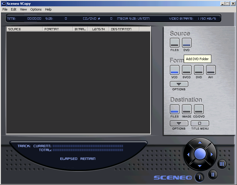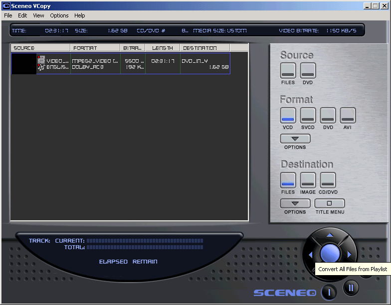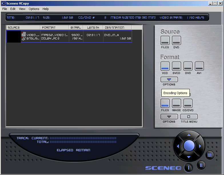 | The universal Video Copy Machine: Sceneo Vcopy converts video files with just three mouse clicks into the right format. No matter if the source is DVD, S-VCD or AVI. You'll always get best results. Sceneo Vcopy works with nanoPEG, an advanced MPEG2 video codec that's used from tv broadcasters. |