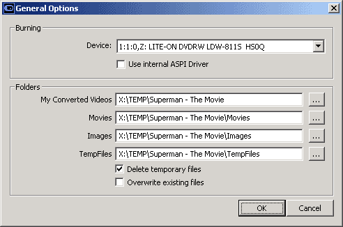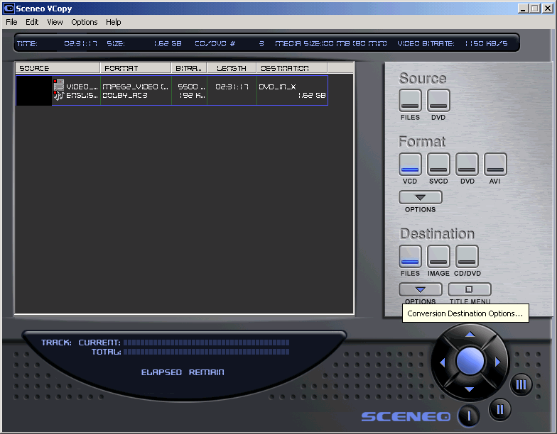 Step 3(a/b/c) - Under the "Destination" select how you want the movie prepared, as "Files" will give you just the Movie itself, as "Image" will create a CD Ready Image, or as a "CD/DVD" to automaticly burn when it's done encoding. Then click on "Options" to set up the desired output. When you are done, click on hte "Convert" button to begin. ![]() b) ![]() c) ![]() |